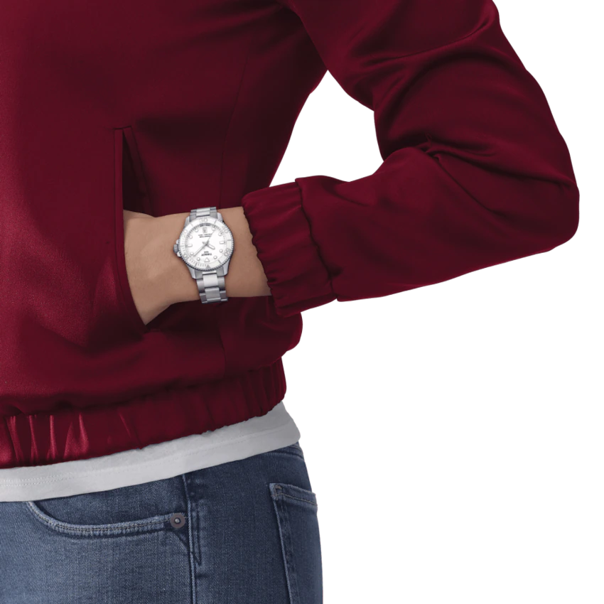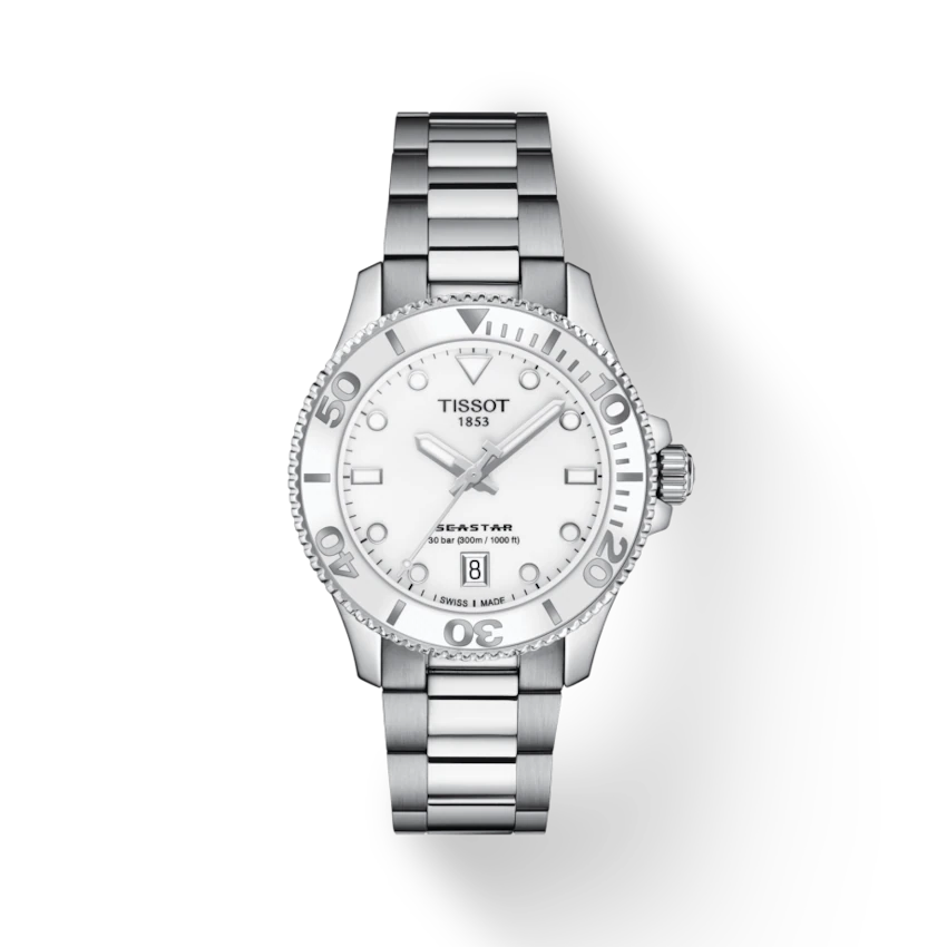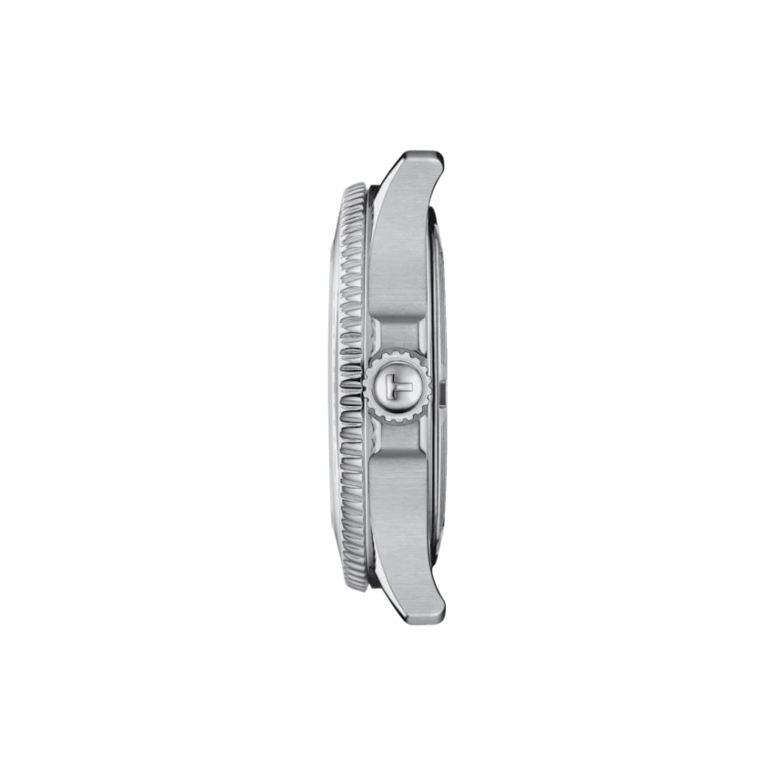 The Tissot Seastar 1000 Chronograph is the instinctive choice for water sports lovers. Its impressive water-resistance up to a pressure of 30 bar (300 m/1000 ft) is combined with the energy of a Swiss-made quartz movement. And features all the element required in a useful instrument: screw-down crown and case back, unidirectional steel bezel with aluminium ring and highly luminescent material for excellent readability in the dark.